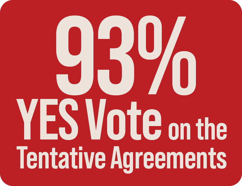 Across our three unions, 93 percent of members who cast a ballot voted yes on ratifying our Tentative Agreements. On the five TAs our members were voting on, the “yes” vote was: