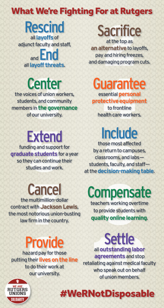 Rutgers University is at a turning point, with a new president taking office and faced with twin health and economic crises in the shadow of a national awakening around issues of racial justice. The Coalition of Rutgers Unions, representing 19 unions and 20,000 workers, has put forward a people-centered approach to prevent layoffs, protect the vulnerable, and safeguard public higher education.