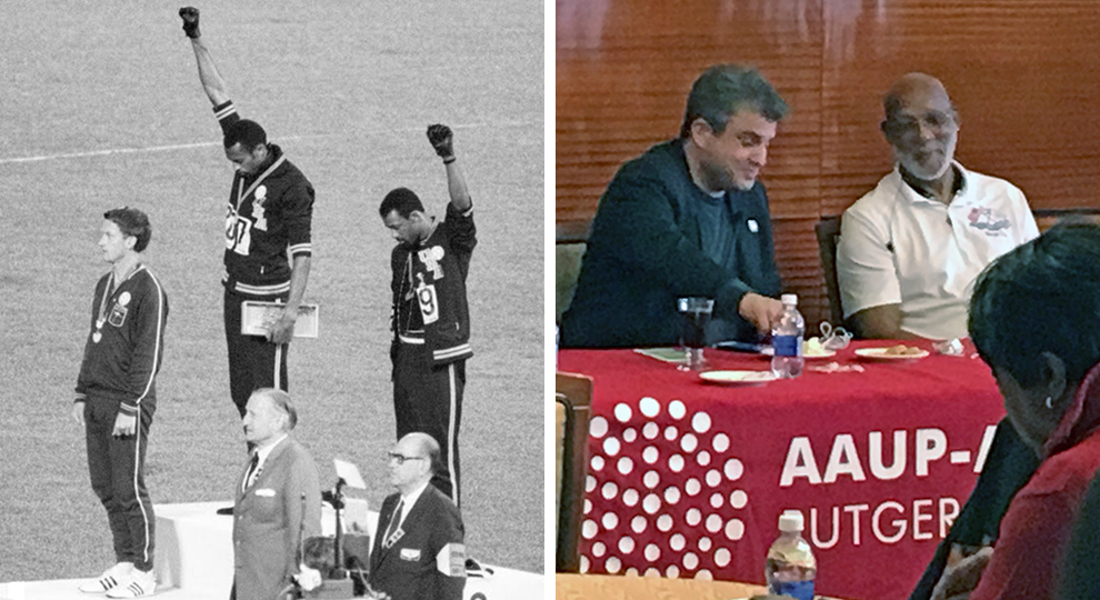 In recent history, the raised fist was most associated with the Black Freedom Struggle. Two athletes, Tommie Smith and John Carlos (who our union toured to all three Rutgers campuses in 2016), made the Black Power salute famous around the world when they raised their fists in the air while standing on the victory podium at the 1968 Olympics.