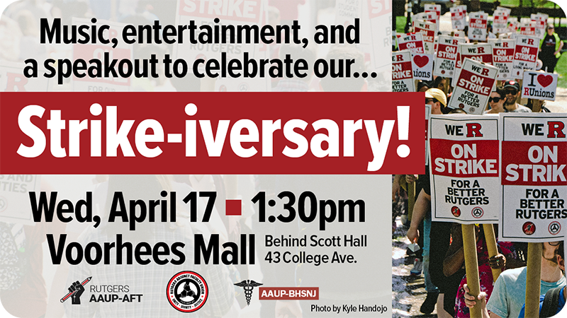 - In New Brunswick, we’re celebrating our first Strike-iversary on Wednesday, April 17, with music, entertainment, and a speakout on Voorhees Mall, behind Scott Hall on the College Avenue campus, starting at 1:30 p.m. Afterward, come to a union open house with food and drinks at Bell House, 11 Stone Street, from 3–6 p.m. Talk to colleagues in your department and plan to come together! Spring is here, and many of us haven’t been together in person since we walked the picket lines.